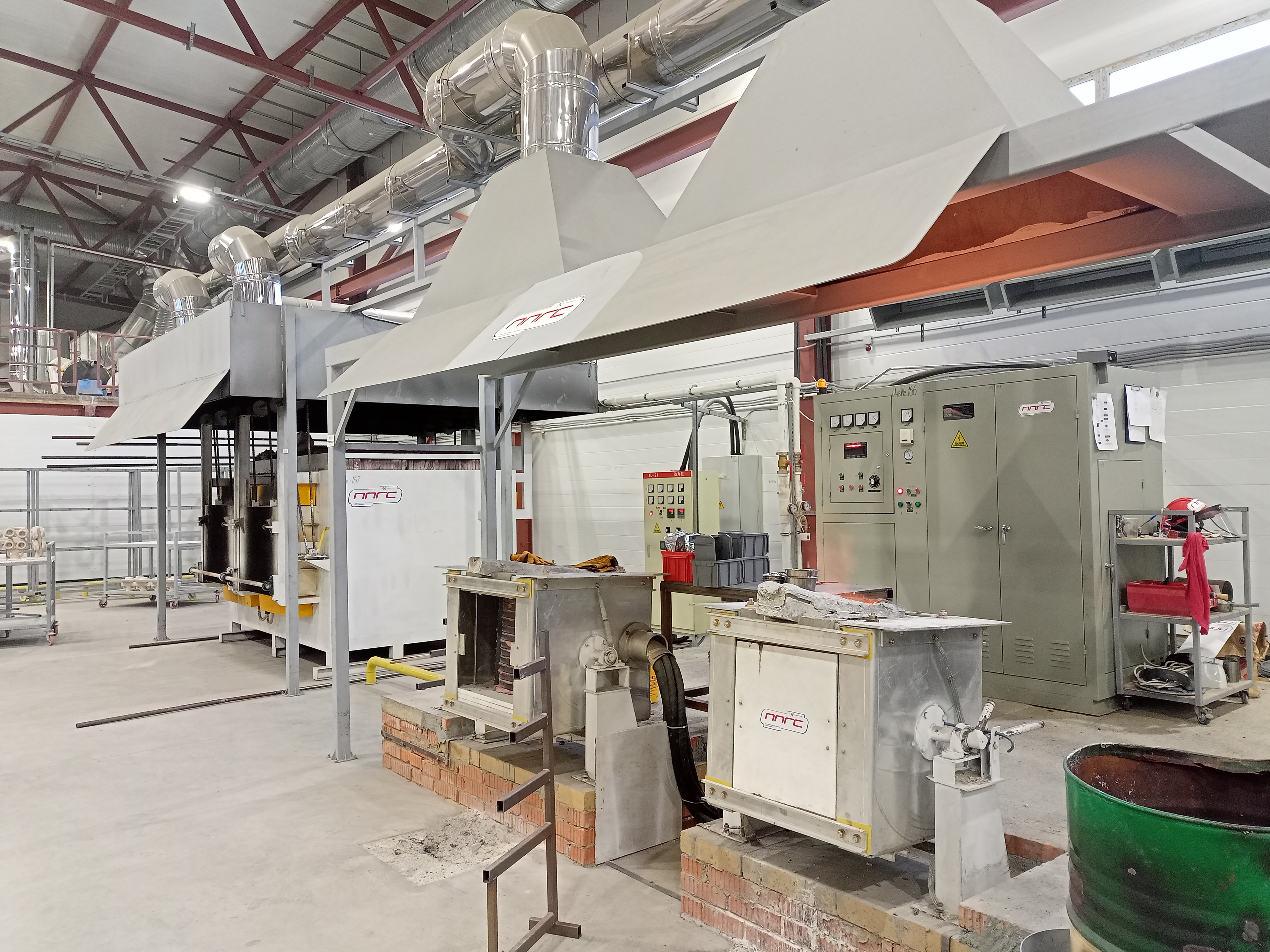 Плавильный цех оборудован двумя современными среднечастотными индукционными печами с тигелями объёмом разливки 120 и 150кг стали за один цикл.